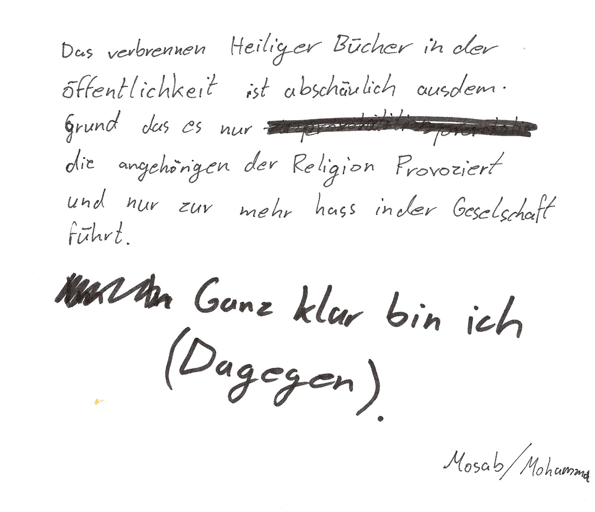 Eine zentrale Frage, die im BÜZ erörtert wurde, lautete: Handelt es sich um Gotteslästerung oder ist die Tat durch die Meinungsfreiheit gedeckt? Für Schweden gilt: „Als erstes Land weltweit hat Schweden 1766 die Pressefreiheit per Gesetz verankert, also vor mehr als 250 Jahren. Damit ist auch das Äußern der eigenen Meinung schon lange ein hohes Gut in dem Land. Der Straftatbestand der Blasphemie wurde 1970 abgeschafft, die Kritik an Religionen gehört zur Meinungsfreiheit.“ (Schweden streitet: Was darf Meinungsfreiheit?)