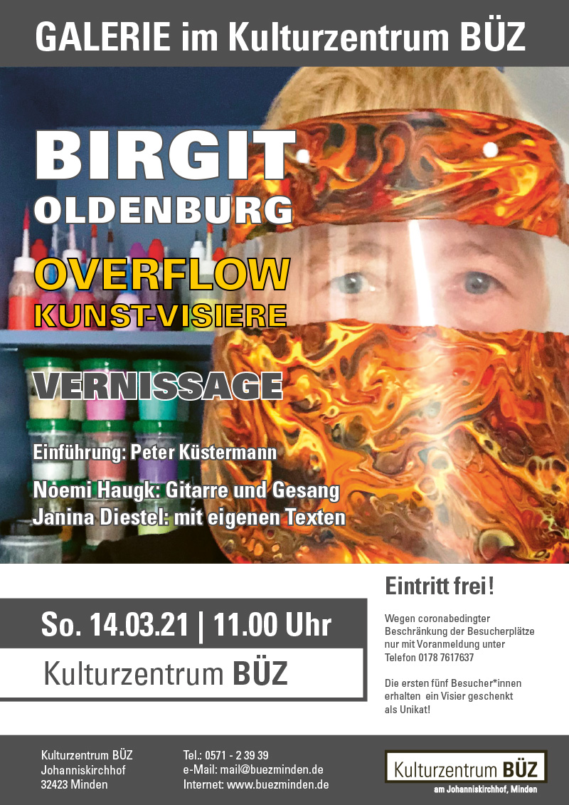 Die Malerin und Autorin Birgit Oldenburg hatte vor zwei Wochen einen Workshop im BÜZ geleitet zum Thema Meine Maske und Ich – Gesichtsschutz-Visiere gestalten. Sie ist aktiv im Verein für Aktuelle Kunst im Kreis Minden-Lübbecke und leitet dort eine Künstlerinnengruppe. Die Vernissage war umrahmt von weiteren Künstlerinnen des Vereins: Noémi Szabina Haugk umrahmte das Programm mit gefühlvollen Passagen auf dem Keyboard, während Ilka Friedsam humorvolle und tiefgehende Gedichte dazu beisteuerte. Im Mittelpunkt der Vernissage standen fünfzehn Werke der Künstlerin in unterschiedlichen Größen.