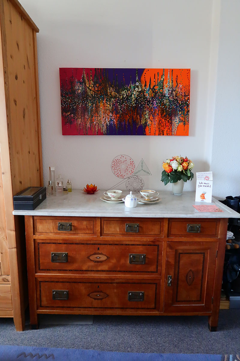 Birgits Bilder faszinieren durch das Überraschungsmoment bei ihrer Entstehung „bis hin zum Suchtcharakter“, wie sie augenzwinkernd gesteht. Beim Malprozess kann die Künstlerin nur annähernd vorhersagen, wie die fertigen Bilder am Ende aussehen werden. Die Betrachter können sich in ihrer Farbenvielfalt und ihren fließenden Formen verlieren.
