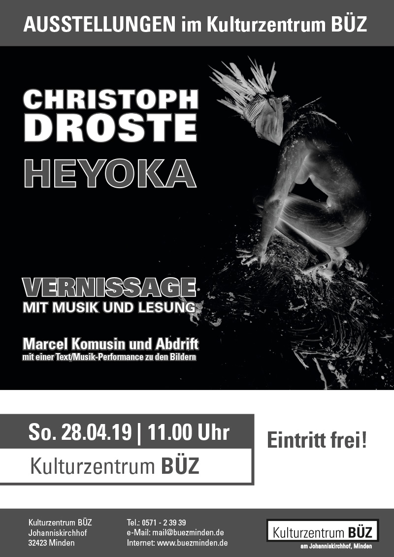 HEYOKA – so nennt Christoph Droste aus Porta Westfalica seine indianisch anmutenden Aktfotos, sorgfältig arrangierte Portraits voller ritueller Accessoires. In Bildern mit Titeln wie MEDI-CINE MAN, YE OLDEN YELLAS, FOGGED, SWALLOW MY YOUTH und 7 SECS WON´T USE A MUSCLE fängt er den Dialog zwischen Körper und Geist ein. Er stellt sich die Frage, wie kleine Ethnien aussehen im Schatten der großen Massengesellschaften und ob heute neue Volksstämme mit einheitlicher Kultur entstehen können. HEYOKA ist für Christoph Droste der Geist des reinigenden Gewitters, in Anlehnung an den Begriff der nordamerikanischen Prärie-Indianer.