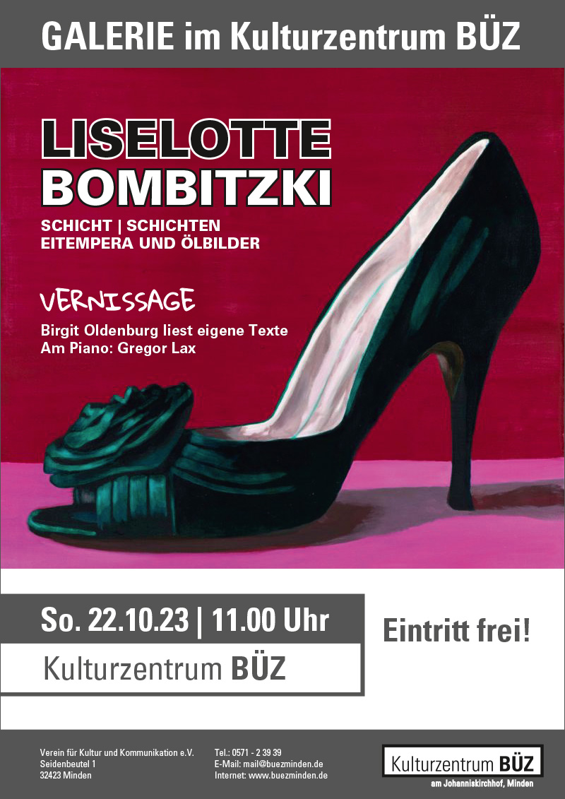 Nach Berlin, London und New York lebt und arbeitet Liselotte Bombitzki jetzt in Minden, wo sie ihren DS9 Kunstraum betreibt. Ihr Ziel ist es, die großzügige gestische mit der gewissenhaft realistischen Malerei zu kombinieren. Die Freiheit des abstrakten Malens war für sie von Anfang an anziehend; sie setzt die Farbfelder nebeneinander, übereinander, gegeneinander, um ihren Charakter kennenzulernen. Die Malerin hält eine konzentrierte Spannung, damit sich das Bild nicht verirrt. Mit diesem Arbeiten in Schichten greift sie in der Natur oder der Gesellschaft vorkommende Schichtungen auf, macht sie zu ihrem Thema, schafft so detailgenaue Ausschnitte aus der Wirklichkeit, dokumentiert und interpretiert sie: ihr detailgetreuer Pumps mit Stöckelabsatz aus dem Jahr 2020 trägt den kritischen Titel „Must have!“