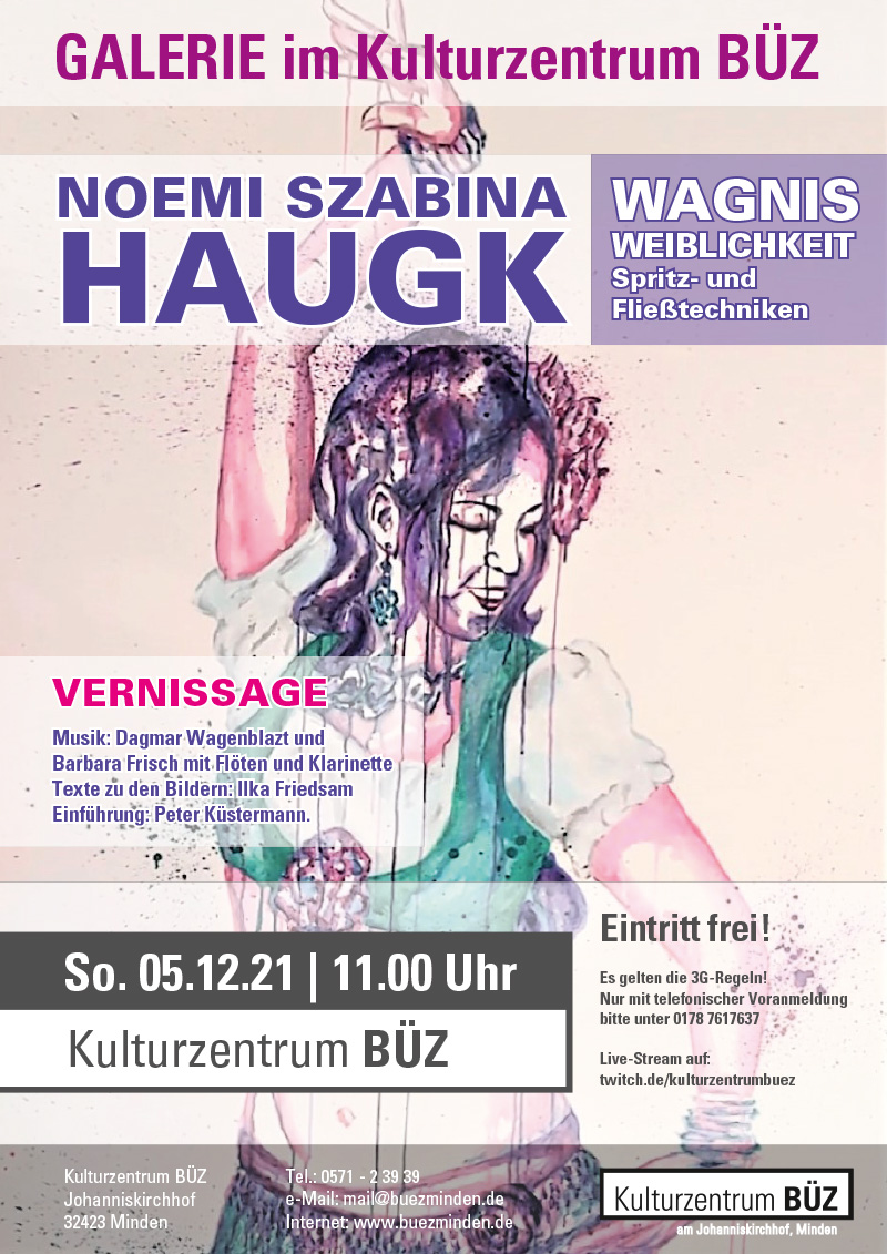 Noémi Szabina Haugk ist gebürtige Ungarin und lebt seit 1986 in Deutschland. Die Künstlerin ist ein Multitalent, als Singer-Songwriterin bereicherte sie soeben unser Open Air - Programm auf dem Dach des Kultur-Containers. Typisch für den Stil ihrer großformatigen Weiblichkeits-Gemälde ist die Verbindung von Spritz- und Fließtechniken. Hierdurch strahlen die Arbeiten eine lebendige Leichtigkeit aus. Malen bedeutet für sie Genesung von schwerer Krankheit.