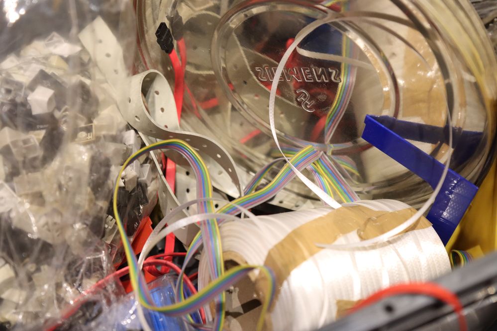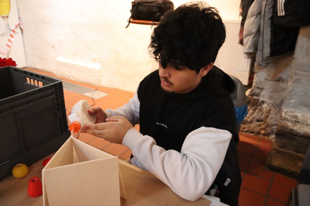 Wieder standen Kisten mit unterschiedlichen Materialien bereit: Metallstücke, Schrauben, Holzelemente, Kunststoffreste, Pappe oder Papier. Ferner diverse Acrylfarben, Pinsel, Scheren, Messer, Sägen, Kleber, Kleberpistole und andere notwendige Utensilien. Für jede Gruppe gab es darüber hinaus eine Arbeitsplatte und die eigene Kiste, die schon mit dem jeweiligen Namen beschriftet war.