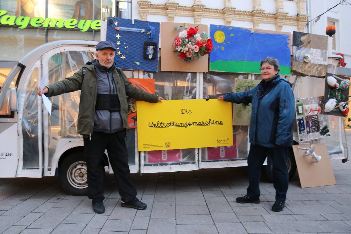 Das Kunstprojekt Weltrettungsmaschine dient zur interkulturellen und intergenerationellen Begegnung von Menschen mit und ohne Migrationshintergrund. Es wird initiiert von der Männergruppe "Feierabend“(von uns in der Altentagesstätte " Treffpunkt " mit Untertstützung vom Förderfonds Kultur & Alter nachhaltig etabliert,, Teilnehmeralter 50 -100 Jahre ) mit unseren Kultur-Scouts (Gruppe geflüchteter Jugendlicher im BÜZ).
