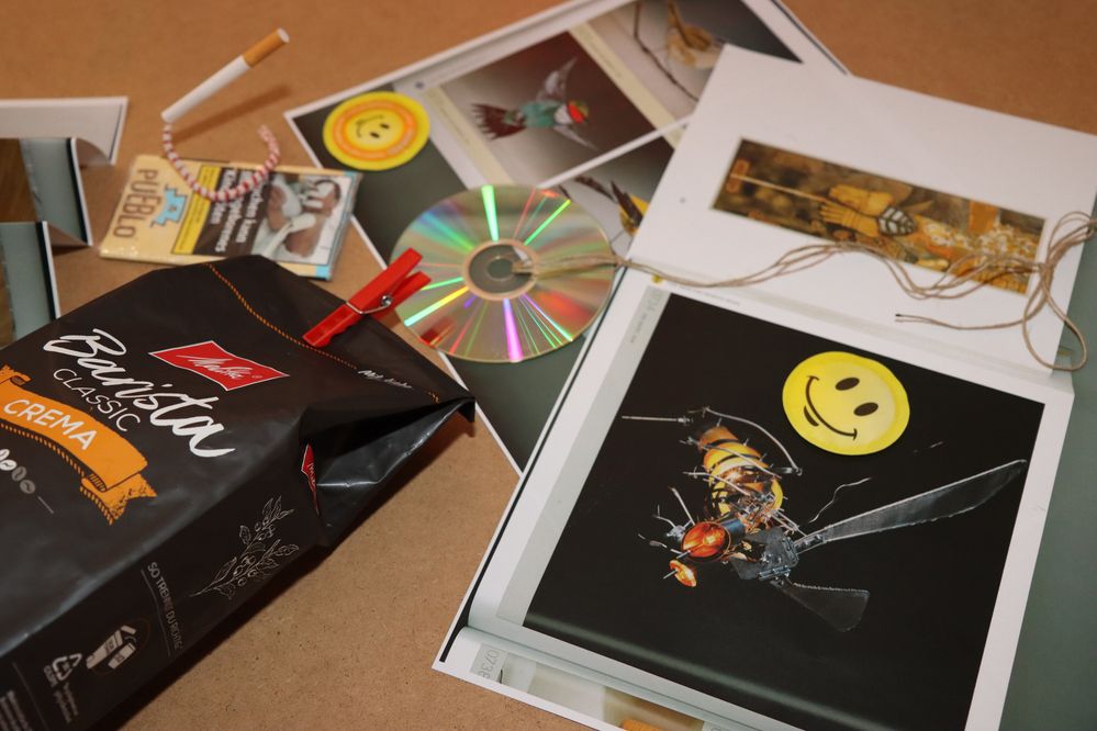 Doch zurück zum Kunstprojekt im Kulturzentrum BÜZ. Es standen Kisten mit unterschiedlichen Materialien bereit: Metallstücke, Schrauben, Holzelemente, Kunststoffreste, Pappe oder Papier. Ferner diverse Acrylfarben, Pinsel, Scheren, Messer, Sägen, Kleber, Kleberpistole und andere notwendige Utensilien. Für jede Gruppe gab es darüber hinaus eine Arbeitsplatte und eine eigene Kiste.
