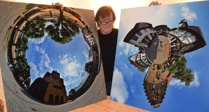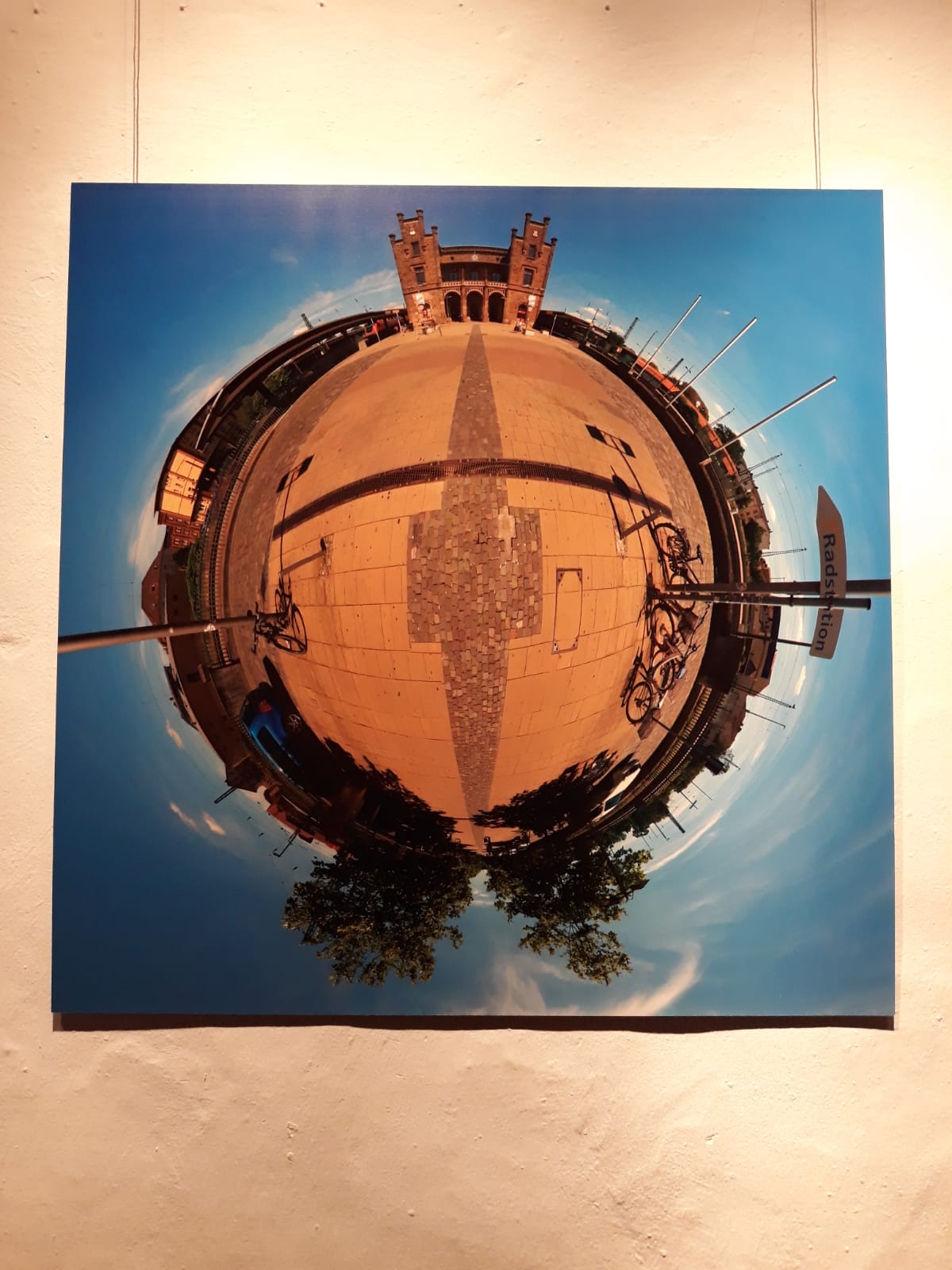 Planet Minden – so nennt der Mindener Fotokünstler Joachim Kohlmeier seine wunderbar verdrehten Stadtportraits, bei denen der Betrachter spontan denkt: das kenn ich doch, aber… irgendwie sehen alle bekannten Gebäude so ganz anders aus. Da wächst der Dom in den Himmel, und der Bahnhof wird kugelrund. Das alles ist mit großer Sorgfalt bis ins kleinste Detail hergestellt. Bei einem Glas Sekt (oder Saft) erklärt Joachim Kohlmeier gern den langen kreativen Herstellungsprozess mit Full Frame, Fischauge, Spheres und Panoramen.