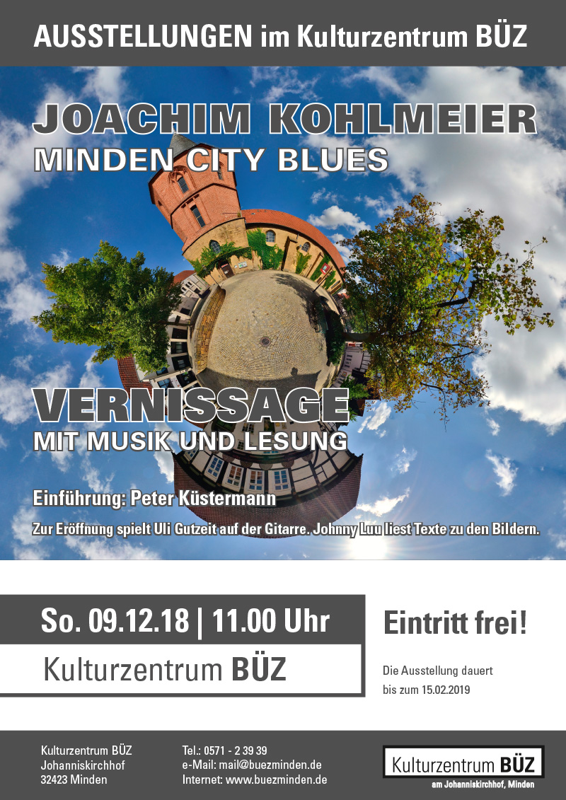 In seiner Ausstellung MINDEN CITY BLUES zeigte der kreative Fotograf Joachim Kohlmeier am 05.02.2019, wie er bekannte Gebäude aus unserer Stadt wunderbar verdreht und verfremdet. Da wächst der Dom in den Himmel, und der Bahnhof wird kugelrund. Planet Minden – so nennt er seine Stadtportraits, bei denen der Betrachter spontan denkt: das kenn ich doch, aber… irgendwie sieht alles so ganz anders aus.