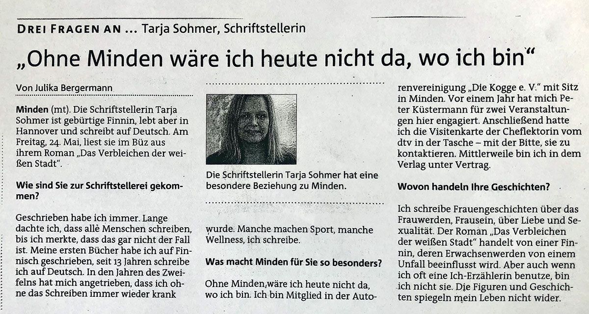 Tarja Sohmer ist Finnin, Autorin (Kogge-Autorin), Dolmetscherin, Journalistin und hat noch immer eine besondere Verbindung zu ihrer Heimat. Sie kam mit etwa 21 Jahren allein nach Deutschland und ist seither öfter in Minden. In dem Literatur-Workshop stellt Tarja Sohmer ihren Roman “Das Verbleichen der weißen Stadt” vor, welcher sich in Finnland auf dem Land und auch in Helsinki abspielt. Um die Zuhörer etwas mit der finnischen Sprache vertraut zu machen, liest sie ein von ihr (mit etwa 15 Jahren) verfasstes finnisches Gedicht “Romeo ja Julia” vor und lässt die Sprache wirken. Im weiteren Verlauf liest sie 25 Minuten einige Szenen ihres Romans zum Thema “junge Liebe” und “Freiheit” vor und verwickelt die Beteiligten in eine ganz andere Welt mit anderen Lebensweisen.