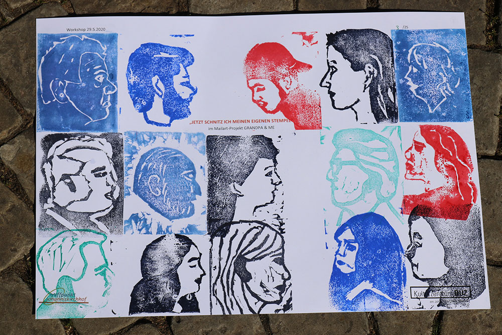 Jetzt schnitz ich meinen eigenen Stempel – auf dem Papier eng zusammen rücken in Coronazeiten: Ein interkultureller und intergenerativer Postkunst-Workshop am 29. Mai 2020 im BÜZ aus der Veranstaltungsserie GRANDPA & ME. „Full house“ herrschte im BÜZ, als bei der dritten Veranstaltung unter Coronabedingungen 18 Teilnehmerinnen und Teilnehmer unter der Leitung der Mailartistin Angela Netmail ihre eigenen Porträtstempel aus einem großen Radiergummi schnitzten. Die jüngste Teilnehmerin war acht Jahre alt und der Älteste zählte 76 Lenze.