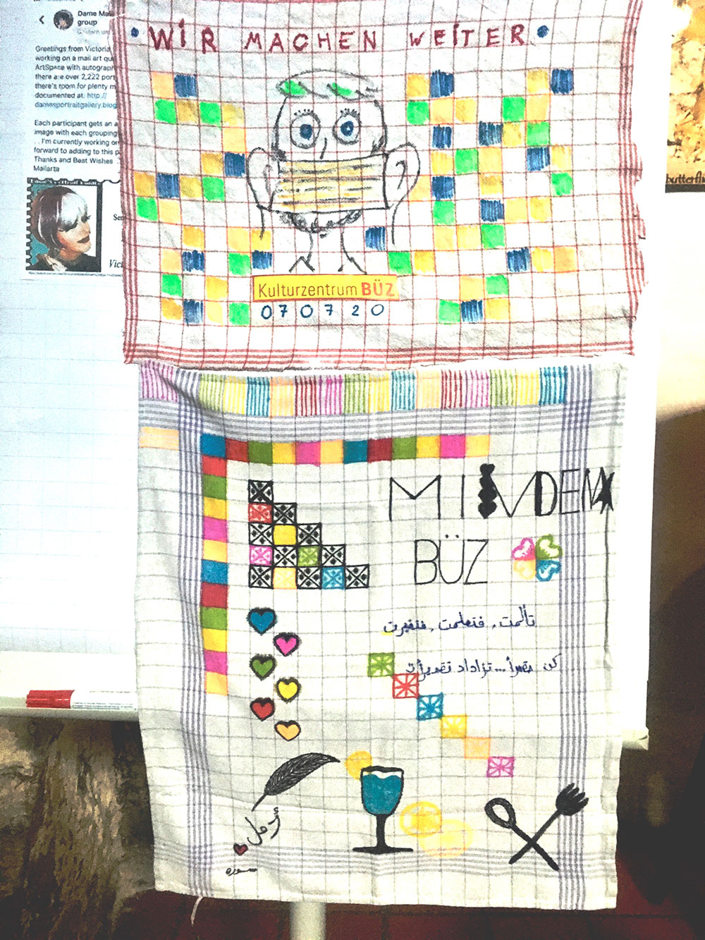 In Corona-Zeiten gelang dem BÜZ in Kooperation mit der Altentagesstätte Treffpunkt Johanniskirchhof eine besonders gelungene Veranstaltung. Im BÜZ waren an den Wänden beeindruckende Werke des Projekts Alt und Jung, Deutsch und Syrer oder auch Großvater und Enkel zu sehen. In Eingangsbereich war das Kunstpostamt aufgebaut. Hier konnten die Briefmarken erworben werden. Im Treffpunkt Johanniskirchhof waren auf Stellwänden Fotos der gemeinsamen Treffen von Opa und Enkel, der Arbeit am Mailart-Projekt, der Ergebnisse und der Rückantworten aus aller Welt. Aus Deutschland, Italien, Finnland, Taiwan, Nordamerika und Mexiko gab es Kunstpostkarten zu sehen. Selbst Exponate aus Uruguay oder Japan konnten bestaunt werden, um hier nur einige Länder und Kulturkreise zu erwähnen. Dazu lief bei Kaffee und Kuchen eine Powerpoint-Präsentation.